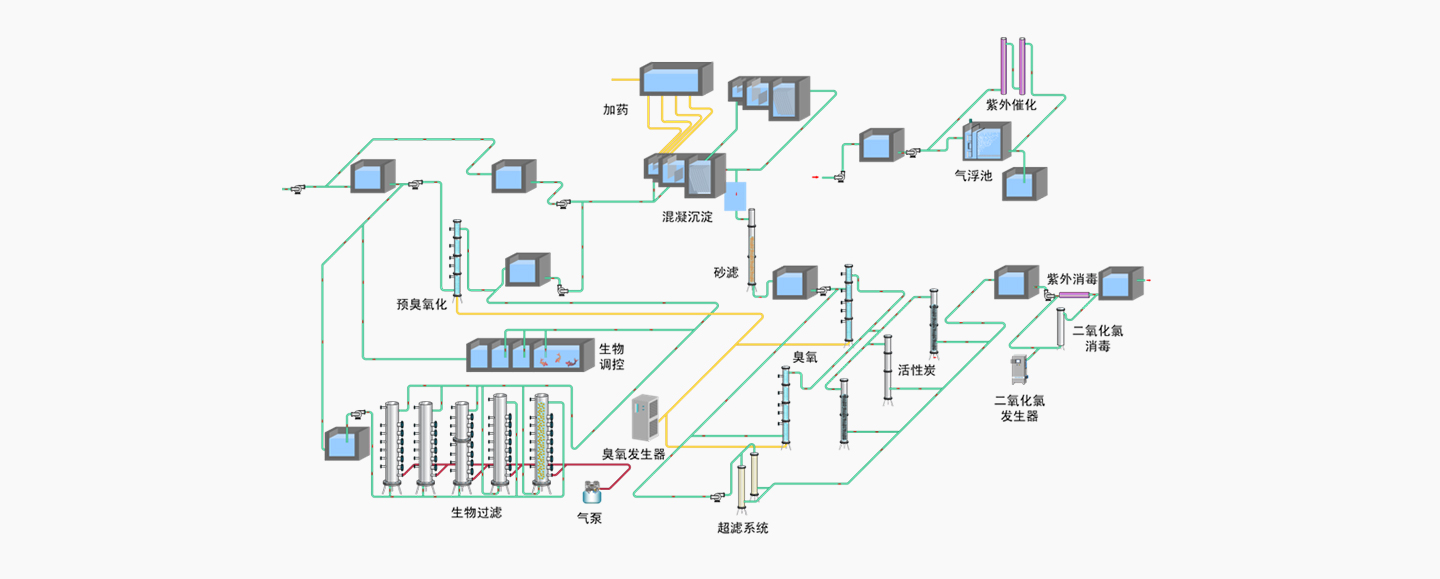 平臺占地面積為250m2,設(shè)計處理規(guī)模為4噸/天,包括受污染水源水預(yù)處理技術(shù)實(shí)驗(yàn)平臺、強(qiáng)化常規(guī)水處理技術(shù)實(shí)驗(yàn)平臺、優(yōu)質(zhì)供水保障技術(shù)實(shí)驗(yàn)平臺、安全水消毒設(shè)備實(shí)驗(yàn)平臺、無線遠(yuǎn)程監(jiān)控系統(tǒng)等。